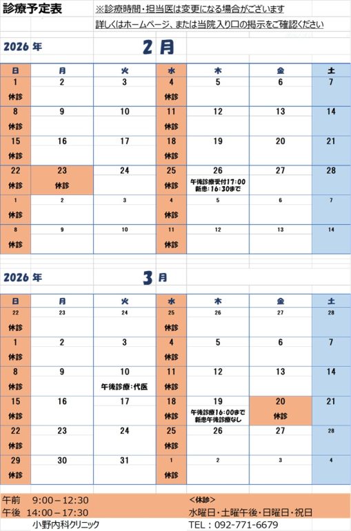 2月・3月のカレンダーを公開と診療時間の変更のお知らせ。